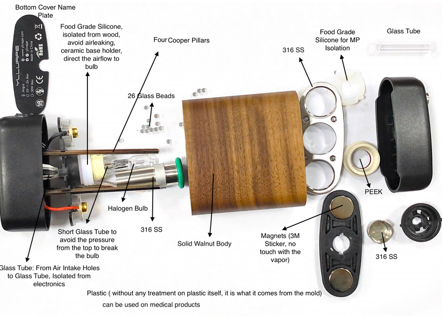 When you inhale, the heated air first passes through the glass balls and then the herbs to generate vapour. The combination of the convection heat from the halogen bulb and the radiation heat from the glass balls produces a vapour that is consistent and flavourful.